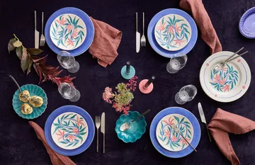 Flowers water lilies lautanen Ø28 cm Mateukselta on Sam Baronin suunnittelema. Käsintehty ja käsinmaalattu lautanen on värikkään näköalaltaan ja siinä on lumpeisiin inspiroiva kuvio. Täydellinen yhdistettäväksi muihin Mateus-kokoelmiin persoonallista tyyliä varten