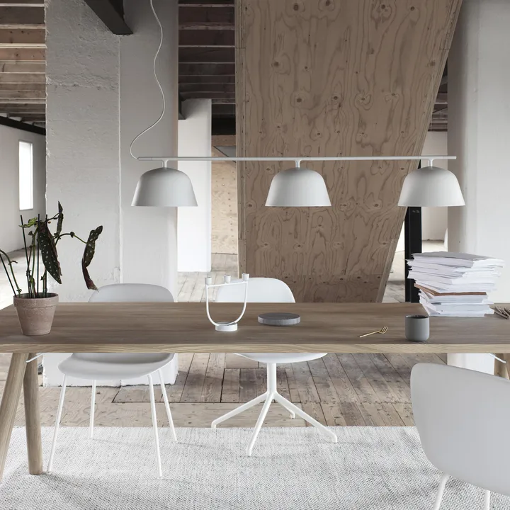 Ambit Rail -kattolamppu Muutolta, suunnittelija TAF, jatkaa suositun Ambit-perheen linjaa. Kolme yhdistettyä varjostinta antavat lämpimän, täyteläisen valon ruokapöydän ylle ja luovat kauniin katseenvangitsijan kattoon. Hillitty muotoilu ja huolellinen rakenne tekevät lampusta helposti sijoitettavan kotiin, kun taas teräsvaijeri ripustuksena antaa vakautta ja tasapainon tunteen. Täydellinen riippuvalaisin, kun halutaan sekä toimivuutta että luonnetta olo- tai ruokailutilaan