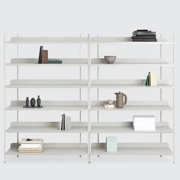 Compile configuration 1 -hyllyjärjestelmä Muutolta, suunniteltu Cecilie Manz, on kestävä hyllyjärjestelmä pulverimaalatusta teräksestä. Taivutetut hyllyt ja teräsputket luovat yksinkertaisen ja tukevan rakenteen. Saatavilla mustana, valkoisena ja harmaana sekä erilaisina yhdistelminä sopimaan tarpeisiisi ja antamaan huoneellesi elegantin ilmeen. Täydellinen sekä kotiin että toimistoon