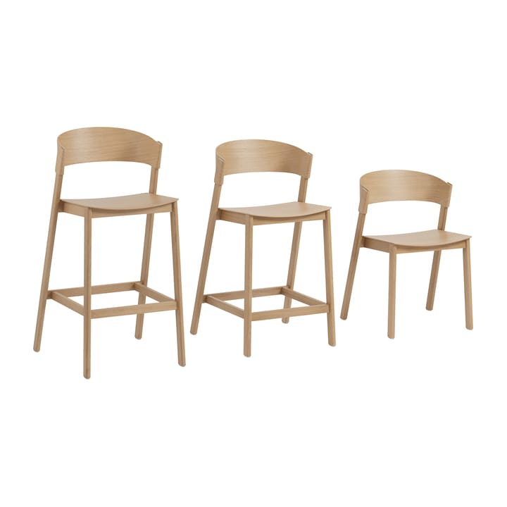 Cover baarituoli Muutolta, suunniteltu Thomas Bentzenin toimesta, valmistettu FSC-sertifioidusta tammesta ja muotoillusta viilusta. Baarituolissa on kaareva selkänoja, joka kauniisti kaartuu takajalkojen ympärille ja sitoo muotoilun yhteen sekä antaa tuolille kevyen ilmeen, joka huokuu skandinaavista muotoilua. Cover voidaan sijoittaa baaripöydän ympärille tai keittiösaarekkeelle, ja tuolin istuin sekä kaareva selkä tarjoavat hyvän istumamukavuuden, jolloin voit istua mukavasti pitkään