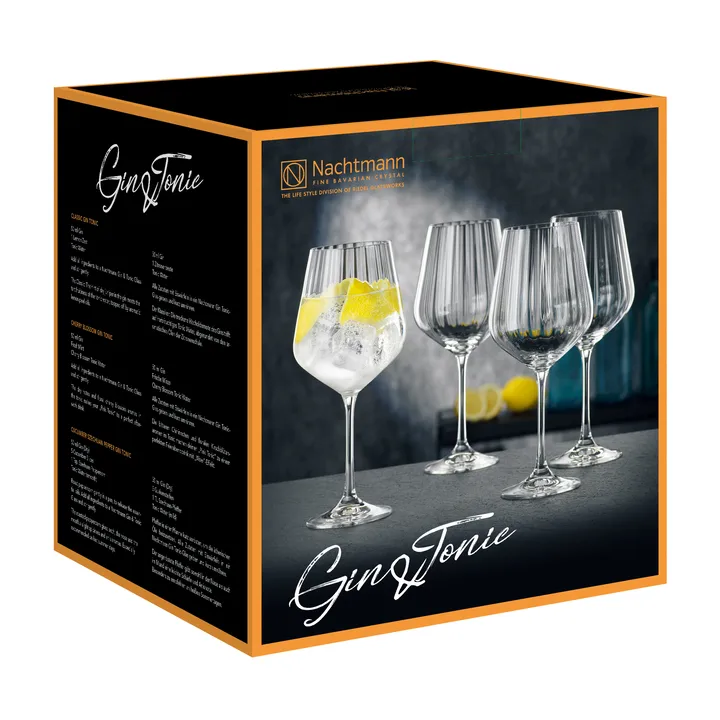 Nachtmannin Gin & Tonic -lasit on valmistettu kauniista kristallilasista ja ne tulevat 4-pakkauksessa. Tyylikkäissä juomalaseissa on 24 pystysuoraa linjaa, jotka luovat vaikuttavan siluetin. Jalan ansiosta juoma pysyy pidempään viileänä, koska kupiin ei tarvitse koskea. Lasit on erityisesti suunniteltu Gin & Tonicille, mutta niitä voi hyvin käyttää myös muiden drinkkien ja juomien tarjoiluun.