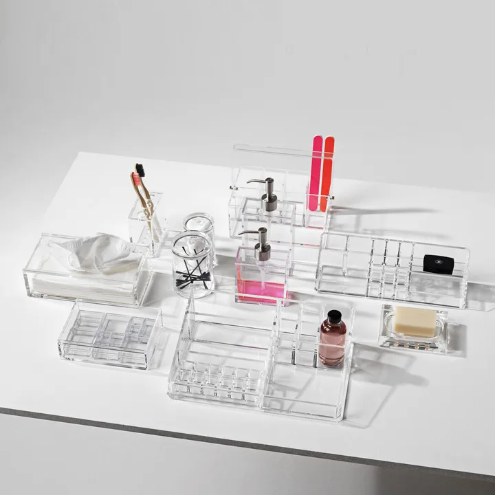 Nomess Copenhagenin kätevä ja käytännöllinen Nomess clear tool box on valmistettu akryylimuovista ja se koostuu neljästä pienemmästä ja yhdestä isosta lokerosta. Siinä on myös siirtämistä helpottava kahva. Se sopii mainiosti kynille tai meikkitarvikkeille.