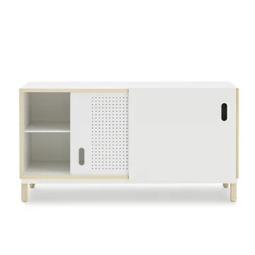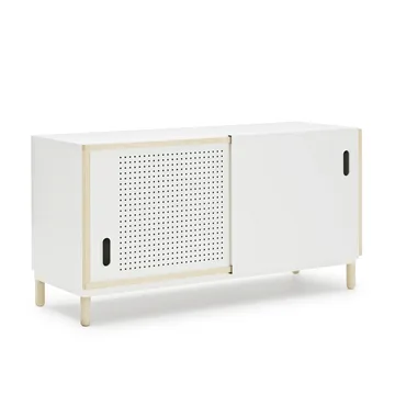 Kabino sideboard small Normann Copenhagenilta on pelkistetty ja monikäyttöinen senkki, jonka on suunnitellut Simon Legald. Huolellisesti viimeistellyt oviyksityiskohdat — joista yhdessä liukuovessa on perforoinnit — tuovat elävyyttä ja rikkovat yhtenäistä pintaa. Saarnirunko luo lämpimän, pehmeän ilmeen, ja integroitu kaapeliläpivienti tekee senkistä helppokäyttöisen myös mediakalusteena. Sopii olohuoneeseen, ruokailutilaan, eteiseen tai makuuhuoneeseen, kun haluat toimivan ja kauniin kalusteen, joka tarjoaa säilytystilaa ja tuo tilaan luonnetta.