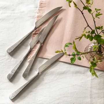 Skye Bright -grilliveitsi Robert Welchiltä on tyylikäs steak knife, jossa on pehmeästi pyöristetty kahva ja kaunis pinta, joka on saanut inspiraationsa perinteisistä hopeasepäntekniikoista. Veitsen terässä on erityisen terävät hampaat, jotka leikkaavat helposti paksuja liha-aterioita