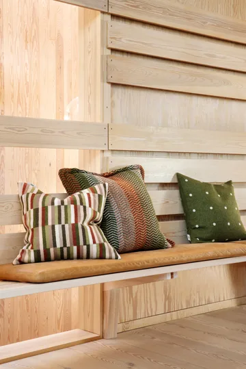 Ida tyyny 50x50 cm Røros Tweediltä on valmistettu lampaanvillasta ja siinä on untuvatäyte. Inspiraatio tulee lappotekniikasta ja käsintehdyistä gobeloinneista, mikä näkyy designin pienissä epäsäännöllisissä yksityiskohdissa