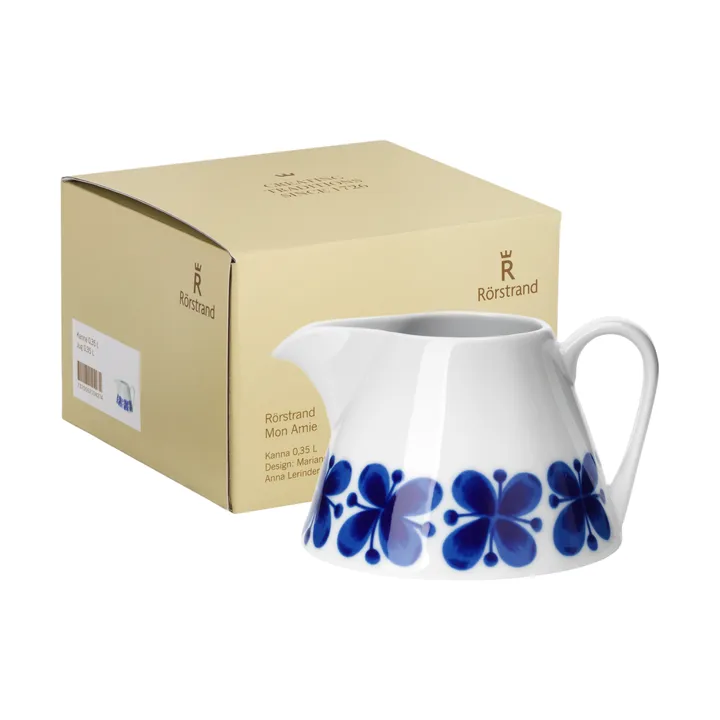 Mon Amie kannu 35 cl lahjapakkaus Rörstrandin valmistama on valmistettu korkealaatuisesta kenttäposliinista. Tämä kaunis kannu on saanut inspiraationsa Marianne Westmanin sadeisen juhannusillan 1940-luvulla piirtämästä valkoisesta kukasta, skvattramista. Kannua koristavat tunnusomaiset kobolttinsiniset kukat, mikä tekee siitä aidon Rörstrand-klassikon