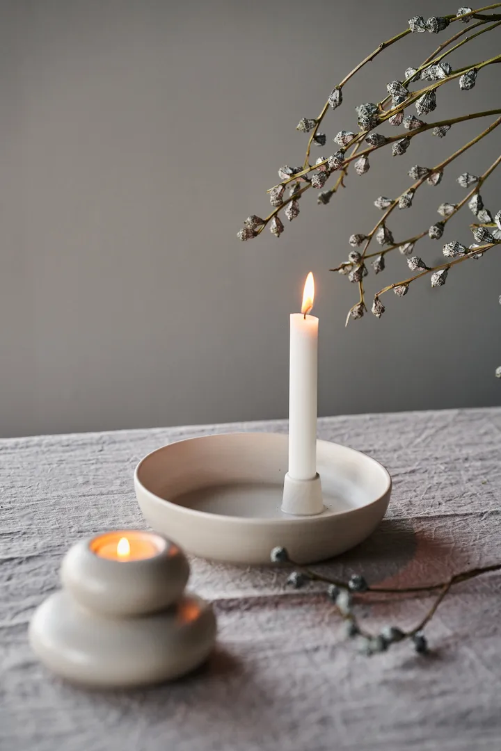 Valley kynttilänjalka Ø21 cm suomalaisen Scandi Livingin valmistama, leveä kulhomallinen muotoilu, johon voit lisätä itse yksityiskohtia ja näin vaihdella kynttiläkulhon ulkonäköä mielialan ja vuodenajan mukaan. Aseta esimerkiksi sammalta tai käpyjä kulhoon, sommittele kaunis asetelma hiekalla, simpukoilla ja kivillä tai täytä se vedellä ja aseta kauniita kukkia – vain mielikuvituksesi asettaa rajat. Suuri kynttilänjalka on valmistettu kestävästä kivitavarasta ja siihen mahtuu yksi kynttilä hieman keskeltä sivuun, mikä luo epäsymmetrisen ja mielenkiintoisen ilmeen. Kynttilänjalka on kaunis esimerkiksi ruokapöydällä tai sohvapöydällä ja sitä on eri väreissä, jotta löydät parhaiten kotiisi sopivan vaihtoehdon