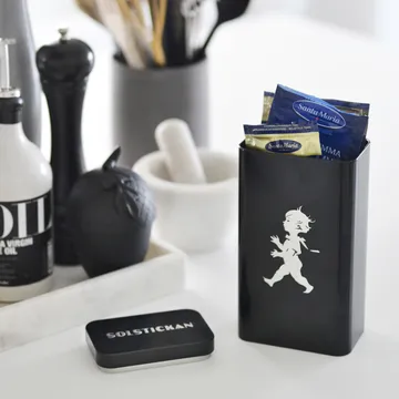 Solstickan kahvipurkki 20,5 cm ruotsalaiselta Solstickan Designilta on metallista valmistettu, käytännöllisesti muotoiltu purkki, johon mahtuu klassinen kahvipakkaus. Purkkia koristaa ikoninen Solstickepojken-kuvitus, jonka Einar Nerman suunnitteli vuonna 1936. Yhdistä näyttävä purkki sarjan muihin yksityiskohtiin luodaksesi klassisen ilmeen sisustukseen
