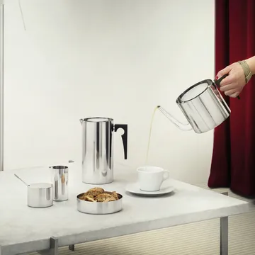 AJ cylinda-line -sokerikulho on minimalistinen, sylinterimäinen muotoilu, jonka on suunnitellut Arne Jacobsen tanskalaiselle Steltonille. Se on tyylikäs yksityiskohta ruokapöydässä ja käytännöllisen kannen ansiosta sokeri pysyy suojattuna ja tuoreena mahdollisimman pitkään. Kansi on lisäksi varustettu pienellä lovella lusikalle reunoissa, jotta se voi aina olla kulhossa mukana
