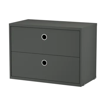 String laatikosto Stringilta, suunniteltu Nisse Strinningin toimesta, on osa klassista String-hyllyä. Tämä laatikosto sisältää kaksi laatikkoa pyöreillä vetimillä, kuten sarjan kaappien ovet. Sopii täydellisesti kaikkiin String Systemin 30 cm syviin lankka- ja plex-sivupaneeleihin. Yhdistä vapaasti luodaksesi oman säilytysjärjestelmäsi. Tutustu rajattomiin mahdollisuuksiin String System -komponenteilla
