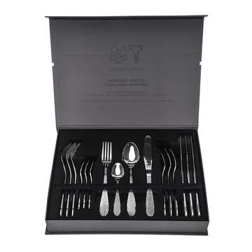 Vargen & Thor -aterinsetti 16 osaa on elegantti aterinsetti, jossa on lämmin messinginvärinen Nimbus-pinta ja kaunis vasarointi, joka kiinnittää huomion kattauksessa. Muotoilu yhdistää pohjoismaisen pelkistetyn ilmeen ja huolellisen käsityön; jokainen osa on valmistettu ruostumattomasta teräksestä (18/10 haarukalle ja lusikalle, 18/0 veitselle) hyvän kestävyyden ja astianpesukoneenkestävyyden takaamiseksi. Setti toimitetaan ylellisessä säilytyslaatikossa, jossa on teräspainatuksella olevia yksityiskohtia, ja sisältää haarukoita, veitsiä, lusikoita ja teelusikoita — täydellinen arki-illallisten ja juhlien kohottamiseen