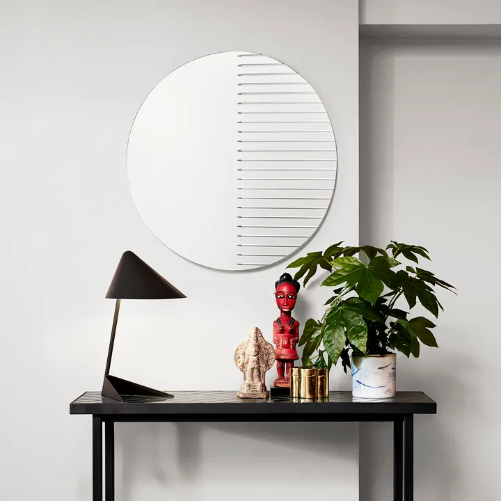 Masquerade Round -peili from Warm Nordic on elegantti peili, jonka on suunnitellut Sebastián Alberdi Masquerade-kokoelmaan. Toinen puolikas on kaiverrettu, mikä luo leikkisän valon ja varjon leikin ja tuo tilaan lisäilmettä samalla kun peili täyttää käytännöllisen tehtävänsä. Aseta se eteiseen tervetulleeksi ensivaikutelmaksi, lipaston päälle makuuhuoneeseen tai koristeelliseksi pisteeksi olohuoneeseen. Kaunis yhdistelmä taiteellista ilmaisua ja käytännöllisyyttä, joka antaa kodille persoonallista luonnetta