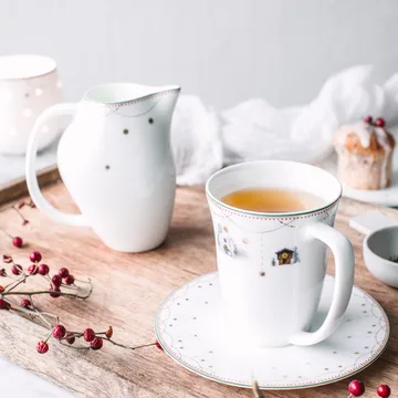 Exklusiivinen sokeri- ja maitosetti Julemorgen -sarjasta Wik & Walsøelta. Valitse tarjoamaan tee- ja kahvitarvikkeet joulukahveille tästä setistä, joka on valmistettu ylellisestä kalsiumporsliinista. Kalsiumporsliini on kestävä materiaali, joka mahdollistaa tuotteiden valmistamisen ohuin seinämin, mikä tekee niistä hieman kirkkaan läpikuultavia. Kevyt ja ohut posliini tuo lisäluksusta ja tekee joulivierailusta entistä ylellisemmän