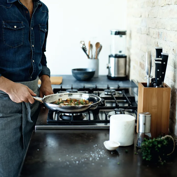 Paistinpannu, jossa korkeat reunat ja lisäkahva, saksalaisen WMF:n Profi Resist -mallistosta. PFOA-vapaa nonstick-pinnoite, jossa on ruostumattomasta teräksestä tehty mehiläiskenno-kuvio parantamaan naarmunkestävyyttä. Paistinpannussa on leveä, tipaton reuna ja se kestää hyvin korkeita paistolämpötiloja